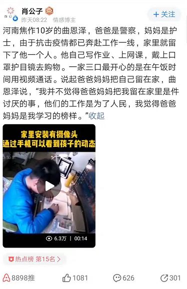 他的爸爸是警察,妈妈是护士,在本次抗击疫情中都奔赴一线,家中只剩他一人。