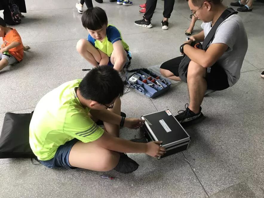 每张桌子坐两个孩子,他们把工具箱打开,里面放着一排排的积木,有的孩子还带了电脑,这是为编程准备的!