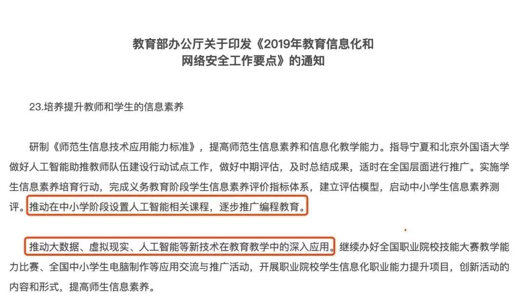 2019年3月13日教育部发布的《2019年教育信息化和网络安全工作要点》,通知明确表示,2019将启动对2万名中小学生信息素养测评,并推动在中小学阶段设置人工智能相关课程,逐步推广编程教育,还将编制《中国智能教育发展方案》。